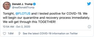 Trump's tweet announcing he and wife Melania's positive test results.